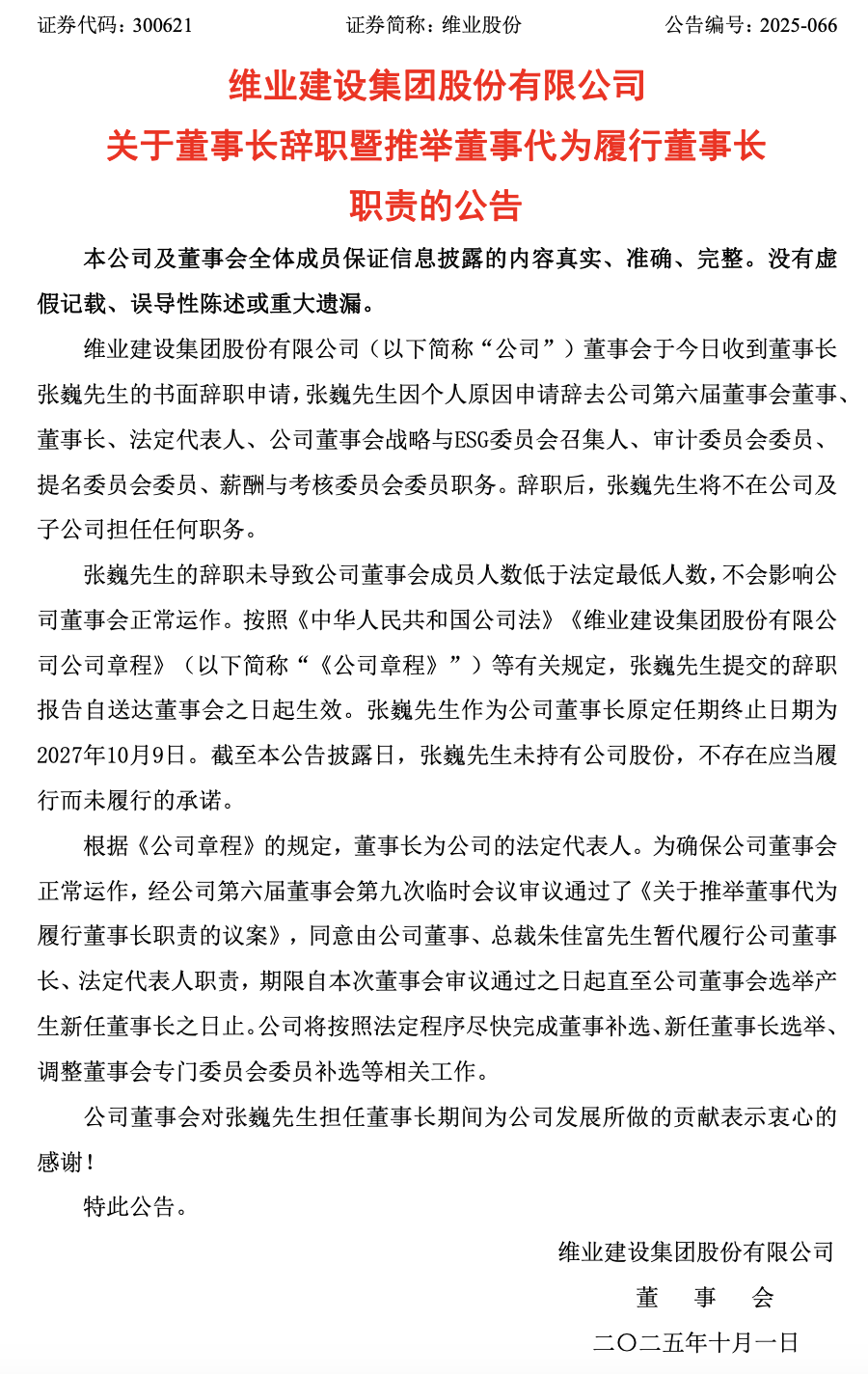 9月30日,维业股份(300621)公告,公司董事会于今日收到董事长张巍的书面辞职申请,张巍因个人原因申请辞去公司第六届董事会董事、董事长、法定代表人、公司董事会战略与ESG委员会召集人、审计委员会委员、提名委员会委员、薪酬与考核委员会委员职务。辞职后,张巍将不在公司及子公司担任任何职务。
