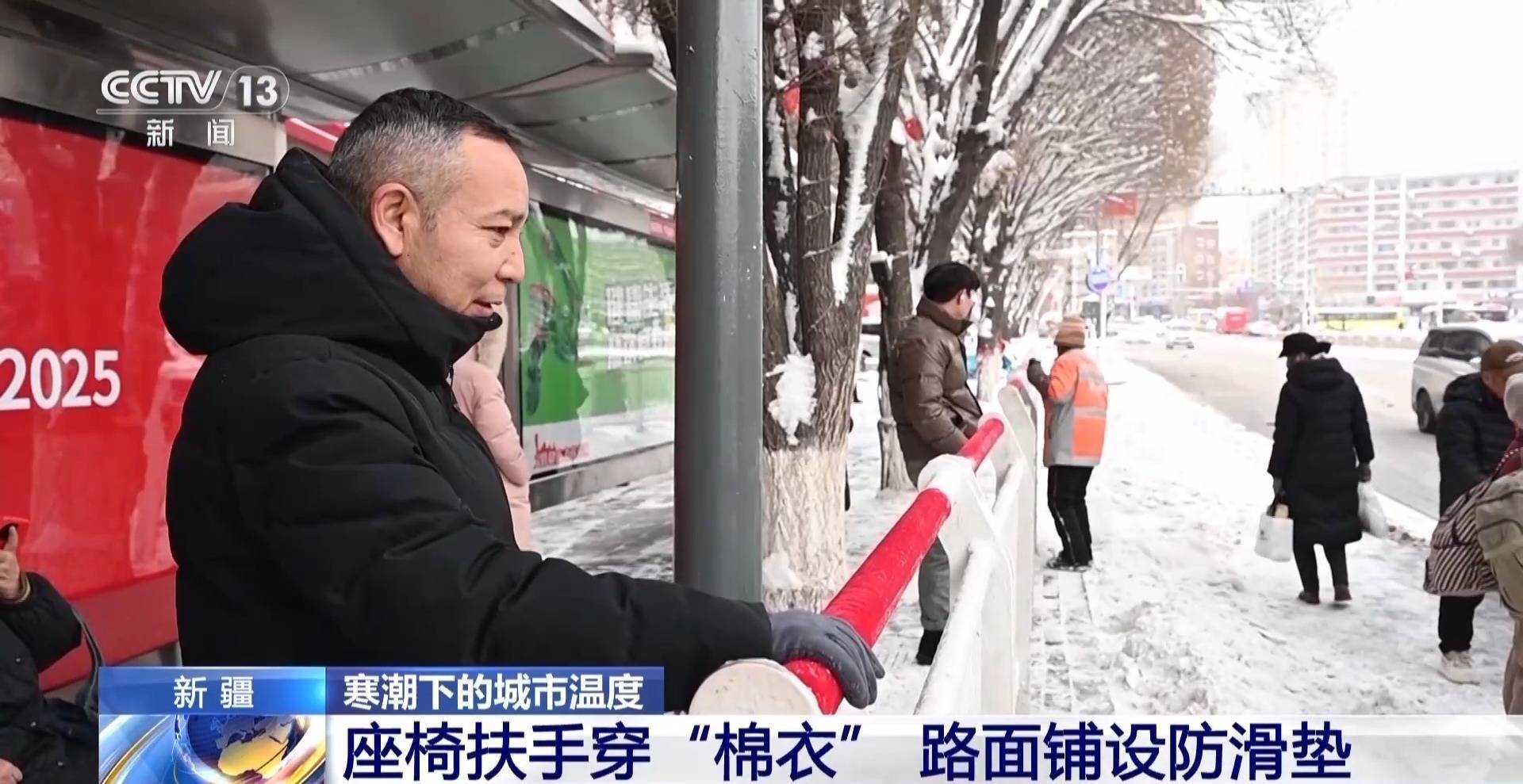 rr座椅扶手穿“棉衣” 路面铺设防滑垫rr在室外,乌鲁木齐市很多公交车站座椅铺上了保温垫,护栏扶手也用织物包裹。